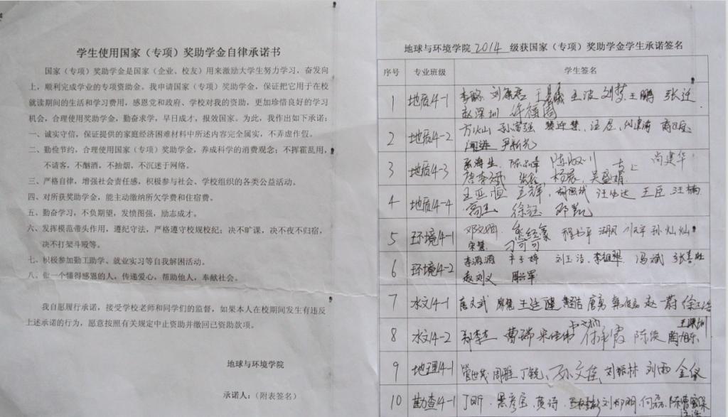 签订承诺书的同时,各年级辅导员还通过飞信、QQ群、班会等形式,动之以情、晓之以理,引导学生“受助思源、获奖思进,诚实守信、自强自立”,把奖助学金用于学业和生活支出,严禁将奖助学金用于请客吃饭、购买奢侈品或其他不当消费。