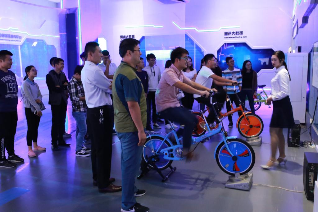 在解说员的带领下,师生党员们深入参观了开发中心的各个展厅,感受到了大数据应用的广阔前景。展厅中包含了很多益智趣味的展区,如幻境的时空隧道、极其便利的生活云亭,煤矿井下VR工作面真实体验以及虚拟骑行,还有便民的服务展区,如社区自助体检、水电缴费自助、话费自助……,同时中心还具有监测和分析的功能,可以实时汇总全国的邮票粮票交易大数据,以及实时监控淮南若干乡村燃烧麦秸秆的情况等等。