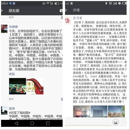 观影活动让党员们更加深入地了解到中国的发展成就,感受到中国日益强大的综合国力。活动后党员纷纷利用微博、微信等新媒体,为伟大的祖国点赞,极大提升了民族自豪感和时代责任感。
