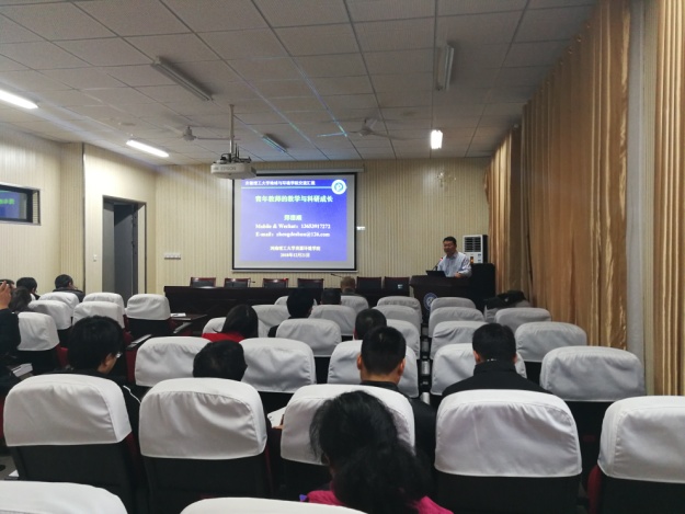 郑德顺作了题为《青年教师的教学和科研成长》的专题报告,从“青椒”经历、教学为本、教研相长、心系学生等方面,结合自己成长的新路历程,分享了自己在河南理工大学组织地球科学馆、认识校园景观和建材石料活动,成立大学生地学探秘协会,开设《中国自然美景及地质成因》公选课,确定科研方向探索历程,指导优秀毕业论文等成功经历。郑教授总结了自己的经验在于“寻找研究方向,潜心调查文献,虚心学习交流,构建科研团队,扎实基础工作,提升成果水平,教学促进科研,科研反哺教学”。认为教学是良心活,要心系学生、宽严并济,在理解和尊重的基础上践行大爱,同时提出了“踏实做事、淡泊名利、不忘初心、桃李天下”的共勉之语,大家在报告聆听中受到诸多启发。