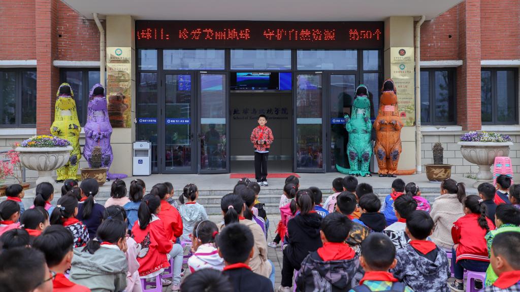4月19日上午,几只“恐龙”突然闯入了校园,引起了同学们的围观。这到底是怎么回事?原来,这是足球心水推荐 开展的“世界地球日”科普宣传系列活动中的气模恐龙巡游环节。
