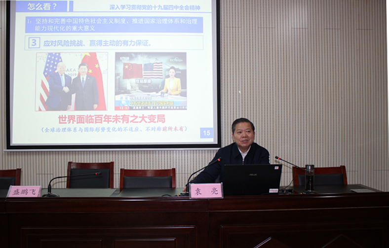 会上,袁亮在个人学习基础上,围绕充分认识坚持和完善中国特色社会主义制度、推进国家治理体系和治理能力现代化的重大意义,深刻领会中国特色社会主义制度和国家治理体系的显著优势,坚持和完善中国特色社会主义制度、推进国家治理体系和治理能力现代化的总体要求、总体目标和重点任务三个方面从“怎么看、怎么办、怎么干”三个视角对党的十九届四中全会精神行了系统阐述和深入解读。在回答“如何加强党的领导,确保全会确定的各项目标任务全面落实到位”这一问题时,袁亮指出全会提出的13个方面的重点任务既是学校坚持和完善现代大学制度、推进内部治理体系治理能力建设的根本遵循,也为学校服务支撑国家治理体系和治理能力现代化指明了方向,是学校新时代高质量发展重大机遇。他强调毫不动摇坚持和巩固中国特色社会主义制度体现在高校就是要坚持完善党委领导下的校长负责制,坚持民主集中制原则,积极构建“党委领导、校长负责、教授治学、民主管理、依法治校”基本治理结构,紧扣“双一流”创建目标,围绕“特色看学科”“水平看专业”“实力看老师”“质量看学生”“形象看生态”“动能看改革”“发展看班子”“根本看党建”的“八看”要求,积极主动进行制度创新和治理能力建设,坚持通过“废改立释”,“八位一体”完善办学治校各项制度,积极引导干部和师生按照制度履行职责、开展工作、立德树人。