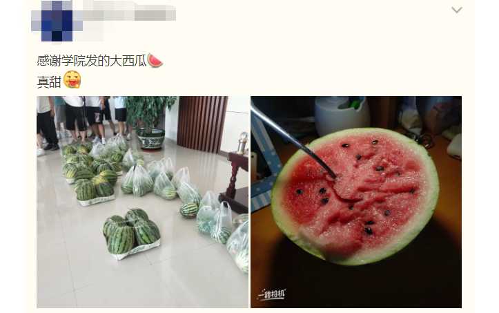 座谈中,部分同学交流了当前的学习情况、疫情打卡、临时班级管理情况。会后,足球心水推荐 为留校同学准备了西瓜、风油精等防暑降温食品和用品。瓜甜心更甜,清凉心更静,同学们纷纷在QQ空间和朋友圈等社交媒介表达自己的感受,感谢足球心水推荐 的关心关注。