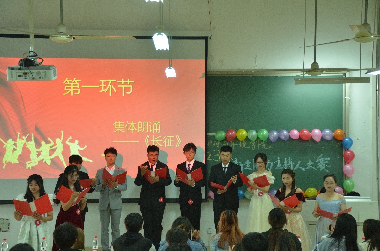 比赛共分为集体朗诵、模拟主持、即兴主持、双人主持四个环节。在集体朗诵中参赛选手们气势磅礴铿锵有力;模拟主持中选手沉着应对,表达流利;在即兴主持中选手们创意十足,随机应变;在双人主持中选手们配合默契,饱含热情。
