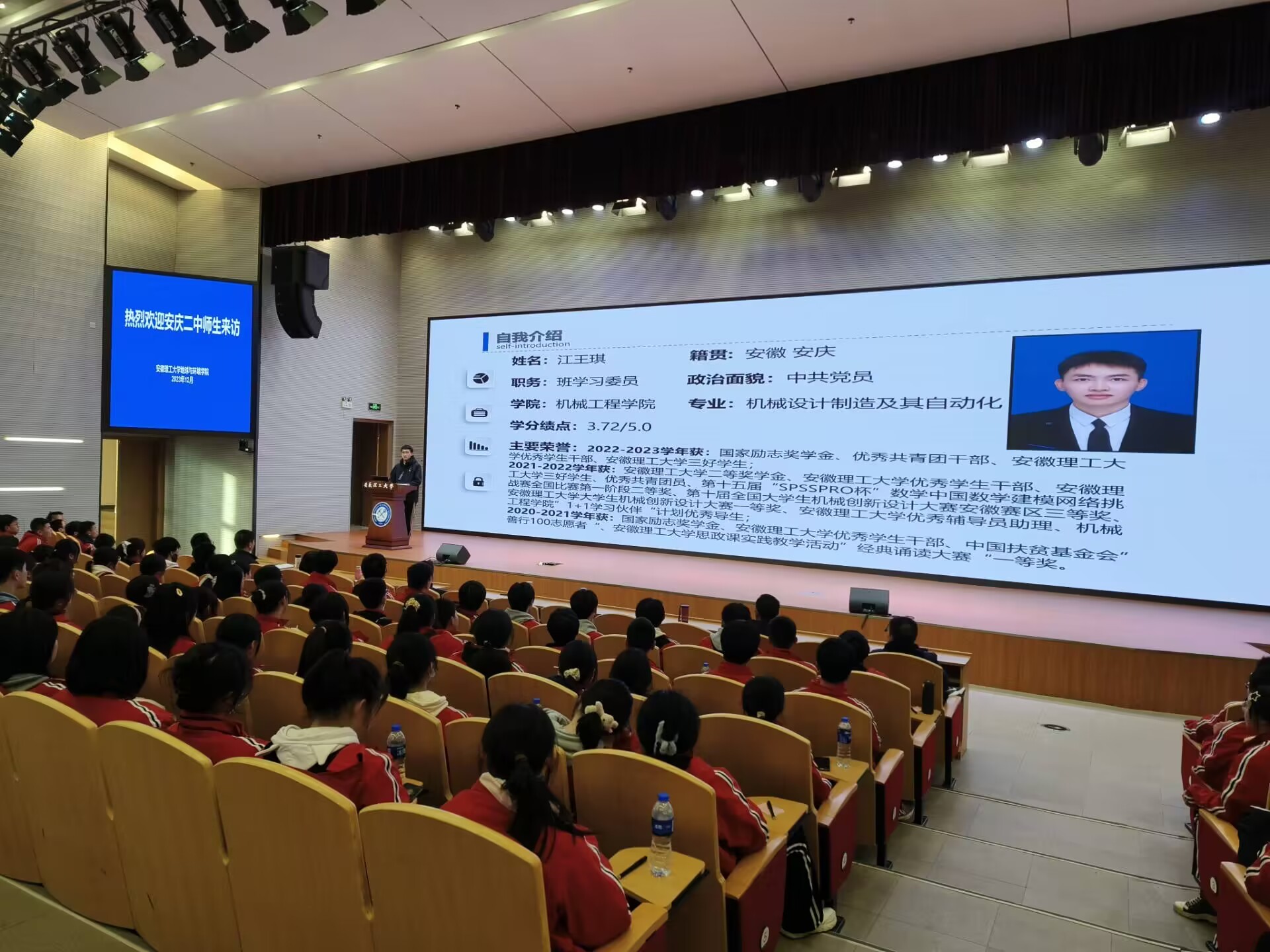 活动伊始,研学师生在舜耕会堂共同观看安徽理工大学宣传片。足球心水推荐 党委书记陈楠、安庆二中党委委员、副校长杨春分别致辞。陈楠以《走进安理,助学筑梦》为题向研学学子介绍了校史校情,安庆二中毕业生、机械设计制造及其自动化专业2020级学生江王琪作大学学习生活报告。