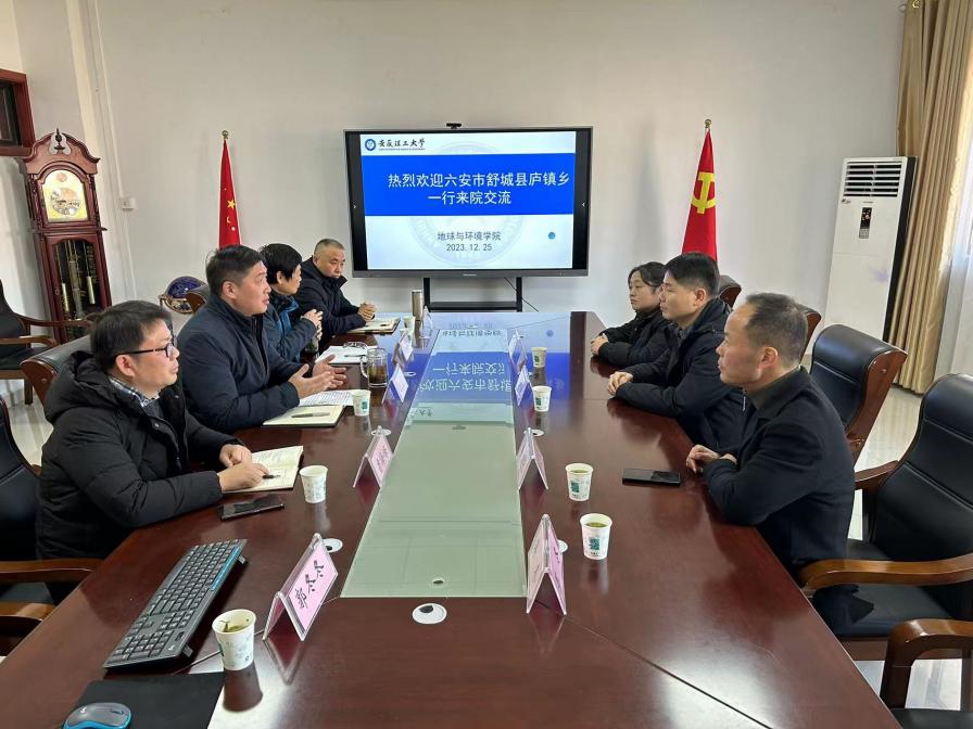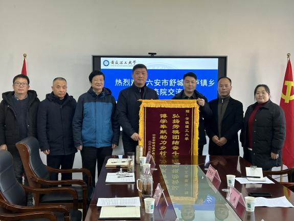 2023年12月25日,六安市舒城县庐镇乡党委书记王涛、乡长韦发长一行来到足球心水推荐-足球心水论坛 赠送题为“弘扬劳模团结奋斗精神 博学奉献助力乡村振兴”的锦旗,对学校为庐镇乡参评第三批全国地质文化村(镇)提供的支持表示感谢。足球心水推荐 党委书记陈楠、副院长吴荣新、鲁海峰和朱恒银教授等参加赠旗仪式与座谈会。