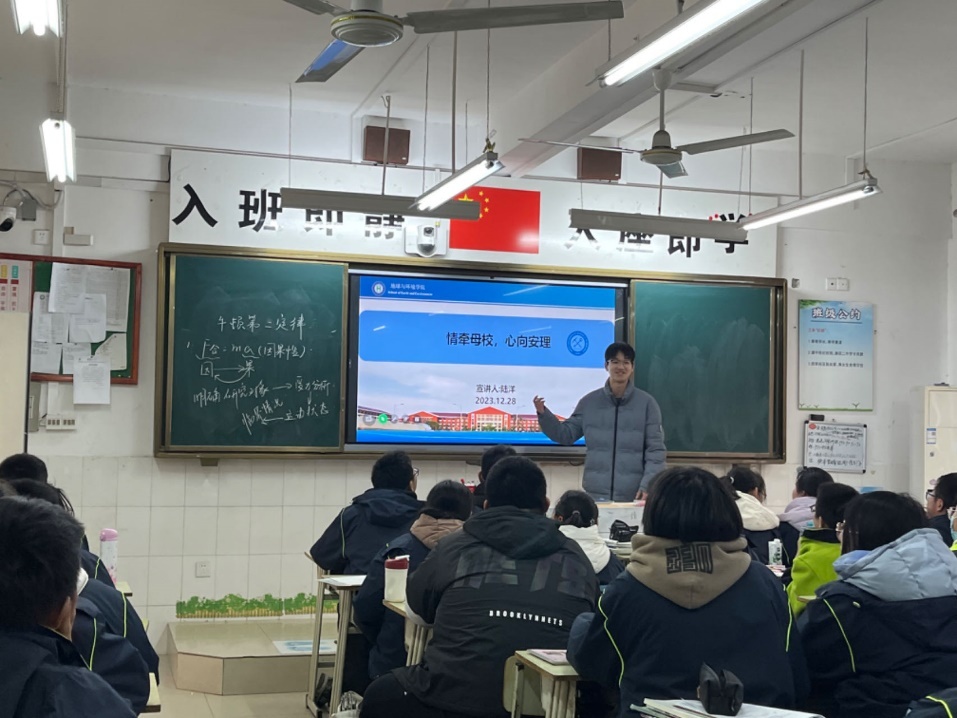 在班级宣讲环节,二中优秀毕业生、环境工程2021级学生陆洋同学介绍了安徽理工大学优美的学习生活环境、丰富多彩的社团活动、浓厚的学术氛围和厚重的校园文化,以及他充实又快乐的大学生活。“团结、奋进、博学、奉献”的校训激励着每一位安理学子积极上进,不断完善自我。对学生们关注的大学生活、奖助体系、保研政策等情况他也进行了详细的讲解。现场学生踊跃发言,交流热烈,纷纷表示,通过学长分享,对安徽理工大学有了更加充分的了解和认识,对未来的大学生活充满向往。