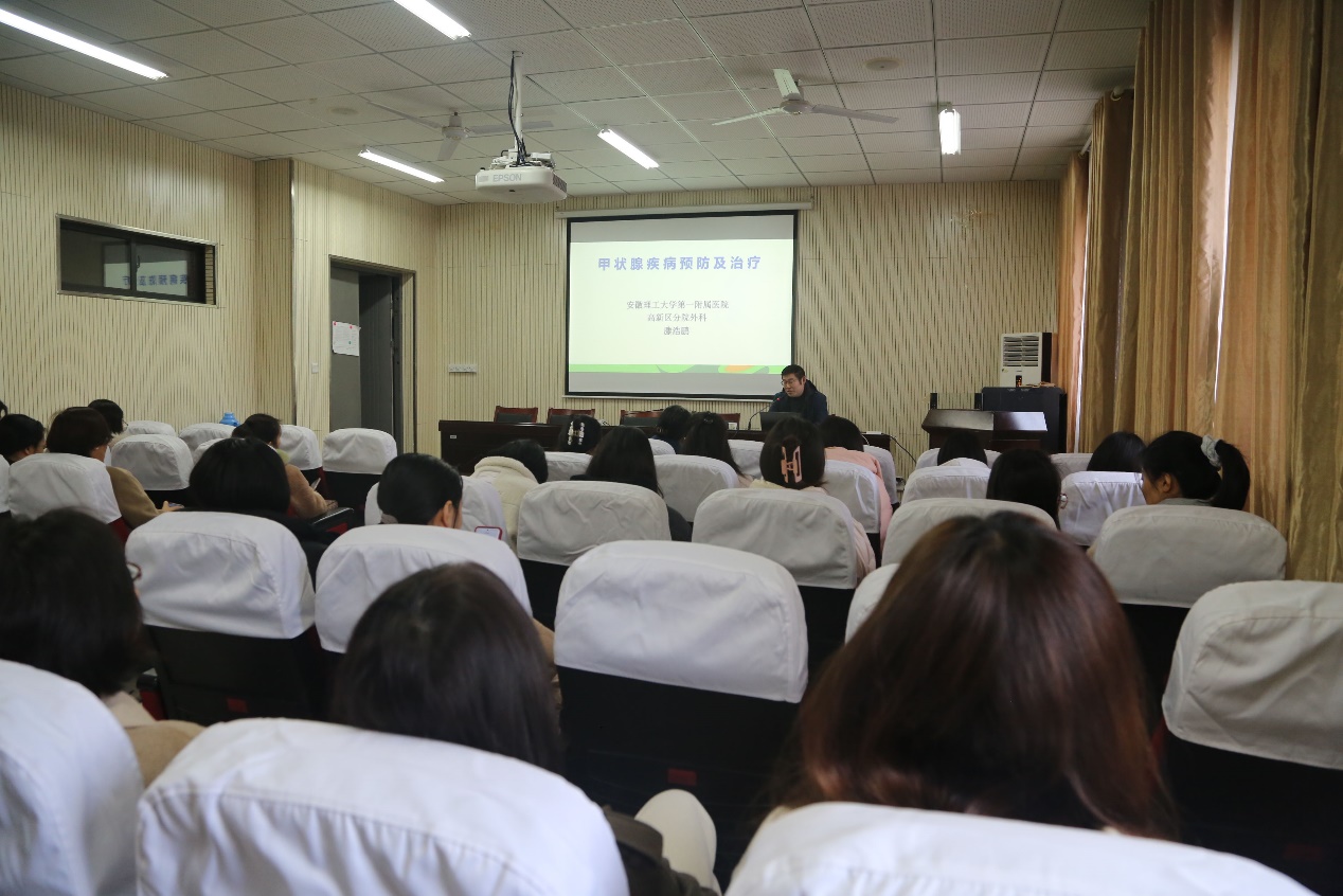 为庆祝第114个“三八”国际劳动妇女节,关爱女教职工身心健康,提升自我保健意识,3月7日上午,校工会邀请第一附属医院滕浩鹏副主任医师进行了以“甲状腺乳腺疾病的预防于治疗”为主题的健康知识讲座,讲座由足球心水推荐 分工会承办,学校女教职工和学生代表现场聆听了报告。