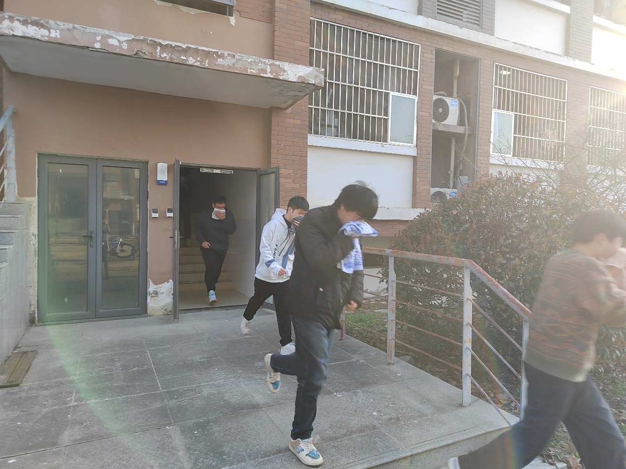 防火逃生应急演练在仁苑2号楼A栋举行,模拟火灾发生前,年级辅导员组织学生学习火灾避险和逃生方法。四点三十分,以哨音警报响起作为模拟火灾发生的信号。学生们以潮湿毛巾、手帕捂住口鼻,弯腰低姿,沿着宿舍楼东西两侧疏散通道就近、快速、安全地撤离到宿舍楼西侧空旷道路上。