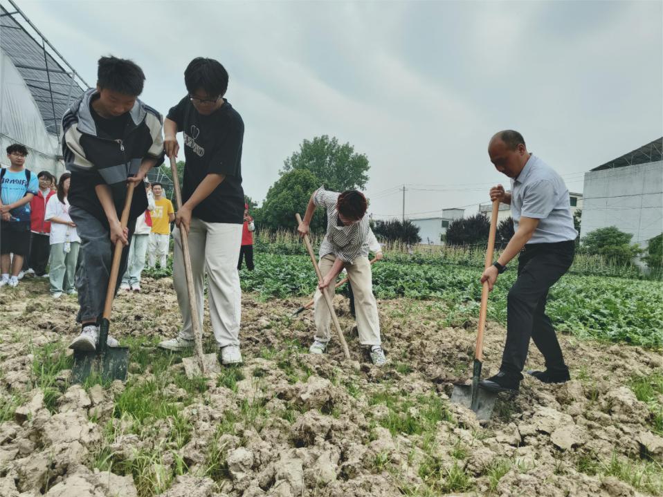 接着在主讲人的带领下,同学们分批开展了劳动体验教育。同学们拿着铁锹、锄头等农具在新华村田间学着挖地、除草、翻土等一系列农活技巧,同学们兴致盎然,纷纷跃跃欲试。劳动教育过程中,张文涛老师指出新华村作为学校帮扶点,为学校输送大量农产品,蔬菜瓜果均采取有机种植、无公害化管理,是新华村绿色发展的重要体现。