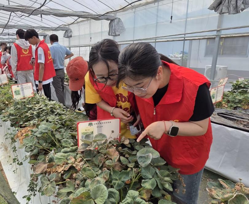 学生在观察草莓长势特点(摄影足球心水推荐 团委提供)