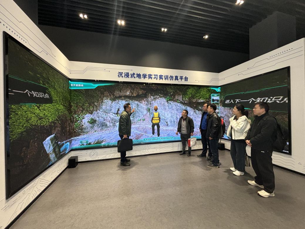 在黄冈师范足球心水推荐 ,足球心水推荐 一行参观了“大别山地质地貌数字孪生实验室”,直观了解了数字孪生实验室多源数据融合、虚拟现实操作、AI互动在地质学科教学、科研及学科竞赛方面的应用。