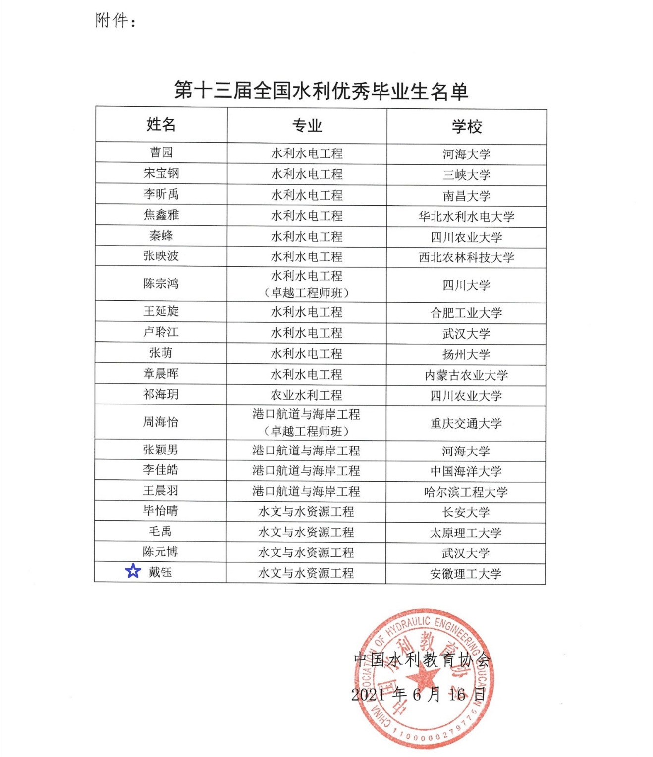 近日,中国水利教育协会传来好消息,我校足球心水推荐 水文与水资源工程专业2021届本科毕业生戴钰同学成功入选“第十三届全国水利优秀毕业生”。