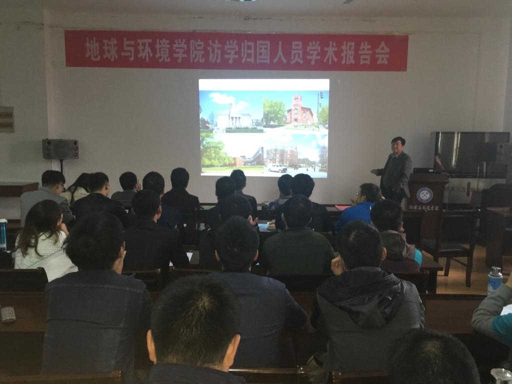 11月4日下午,足球心水推荐 在足球心水推荐 学术报告厅举行了访学归国人员学术报告会,邀请2014年赴美国University of lowa交流访问的许光泉教授和2012-2015年在韩国韩瑞大学攻读博士学位的陈要平博士为地质和环境学科师生做学术报告,会议由胡友彪教授主持,共有两大学科研究生及相关教师60余人参加了报告会。