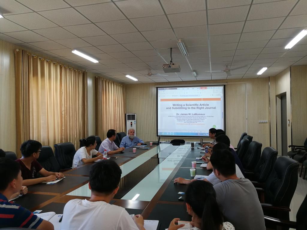 James W.LaMoreaux教授在“Writing a Scientific Article and Submitting to the Right Journal”报告中,围绕高水平科研论文的写作与投稿进行阐述。作为国际SCI期刊《Environmental Earth Sciences》、《Carbonates and Evaporites》和《Sustainable Water Resources Management》杂志主编,James教授从这几种国际期刊的投稿主题和要求入手,从科研论文的选题、初稿写作、修改流程,以及Springer出版社投稿分析系统使用、论文润色等多个方面,同与会师生共同分享了高水平论文的完成过程。James教授具有丰富的主编经验,结合自身的科研和工作情况,告诉了大家开展科研和论文撰写的学术态度。Wanfang Zhou教授作为国际知名水文地质、环境地质专家,以及国际SCI期刊《Mine Water and the Environment》副主编、多个国际SCI期刊编委,在报告中与大家一起讨论了矿井水类专业论文的撰写及发表技巧,并给出诸多论文发表的意见和建议。